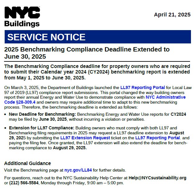 Please see below for an important update on the May 1 Local Law 97 deadline.