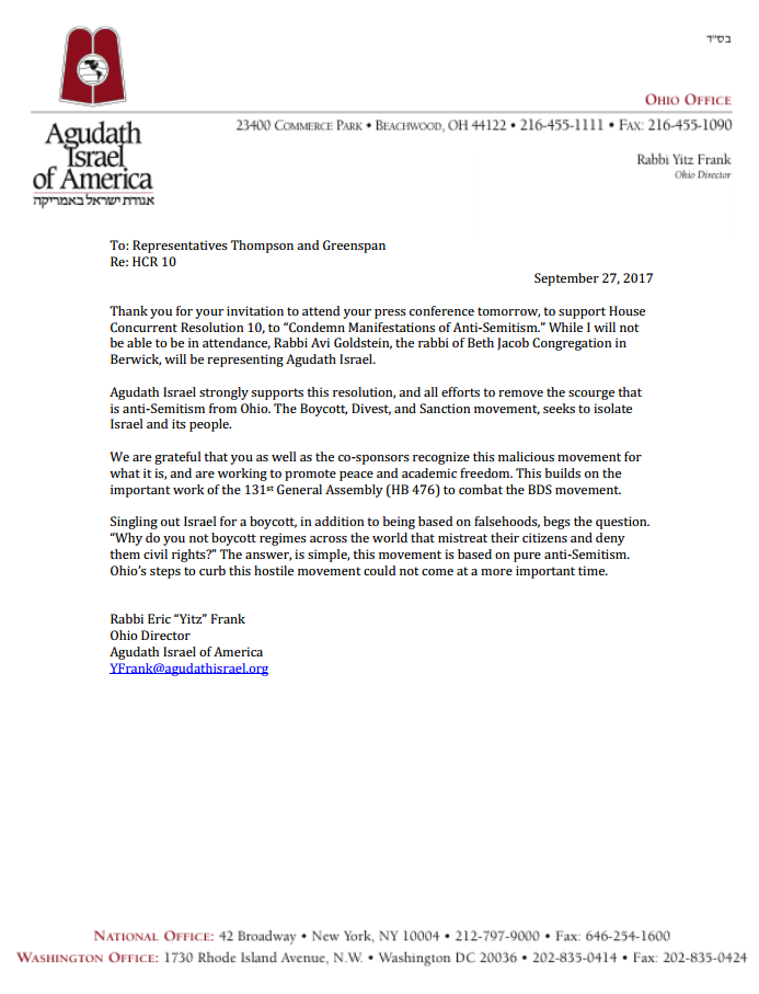 Upon the request of the sponsors of the resolution, Rep. Dave Greenspan (R-Westlake) and Rep. Andy Thompson (R-Marrietta), Agudath Israel provided support for this resolution and participated in a press conference to promote its passage.