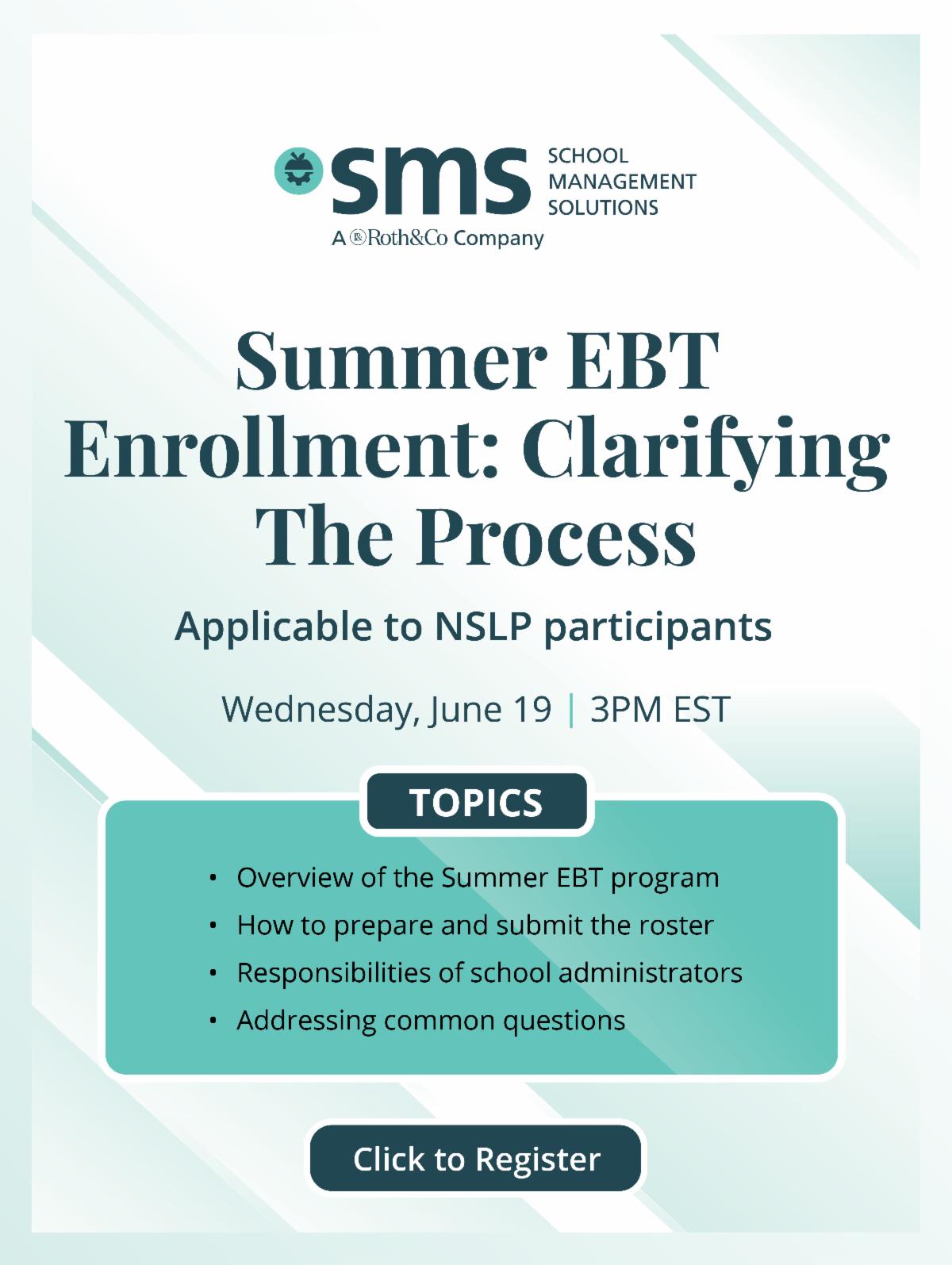 We are pleased to share that School Management Solutions will be hosting a webinar this Wednesday, June 19 at 3 PM entitled “Summer EBT Enrollment: Clarifying the Process”.
